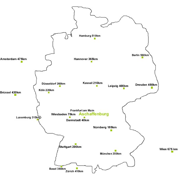 ca. 35km östlich von Frankfurt am Main direkt an der A3 und der A45Fahrtzeit PKW von Frankfurt Zentrum ca. 35min / Frankfurt Flughafen ca. 30min (je nach Verkehr)